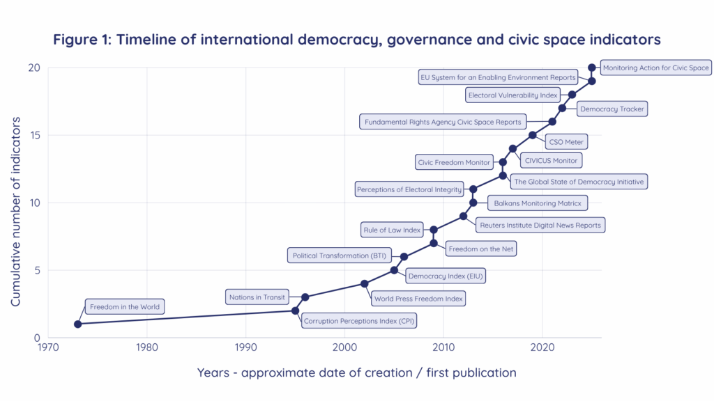 Existing tools provide in-depth and comprehensive information on democracy and civic space, aggregating information contained in news sources, reports, and expert information. Work started early in the 1970s with Freedom House’s Freedom in the World Index, followed by exponential growth in governance and democracy indicators (see figure 1) in the civic space field. The CIVICUS Monitor has been joined by more recent newcomers such as the European Center for Not-for-Profit Law’s (ECNL) CSO Meter and Monitoring Action for Civic Space (MACS), as well as the EU System for an Enabling Environment (EU SEE). While these tools are implemented by civil society, others are produced by intergovernmental bodies, such as International IDEA’s Global State of Democracy (GSoD) indices and Democracy Tracker, or the EU Fundamental Rights Agency’s (FRA) annual update on civic space in the EU and in candidate countries.