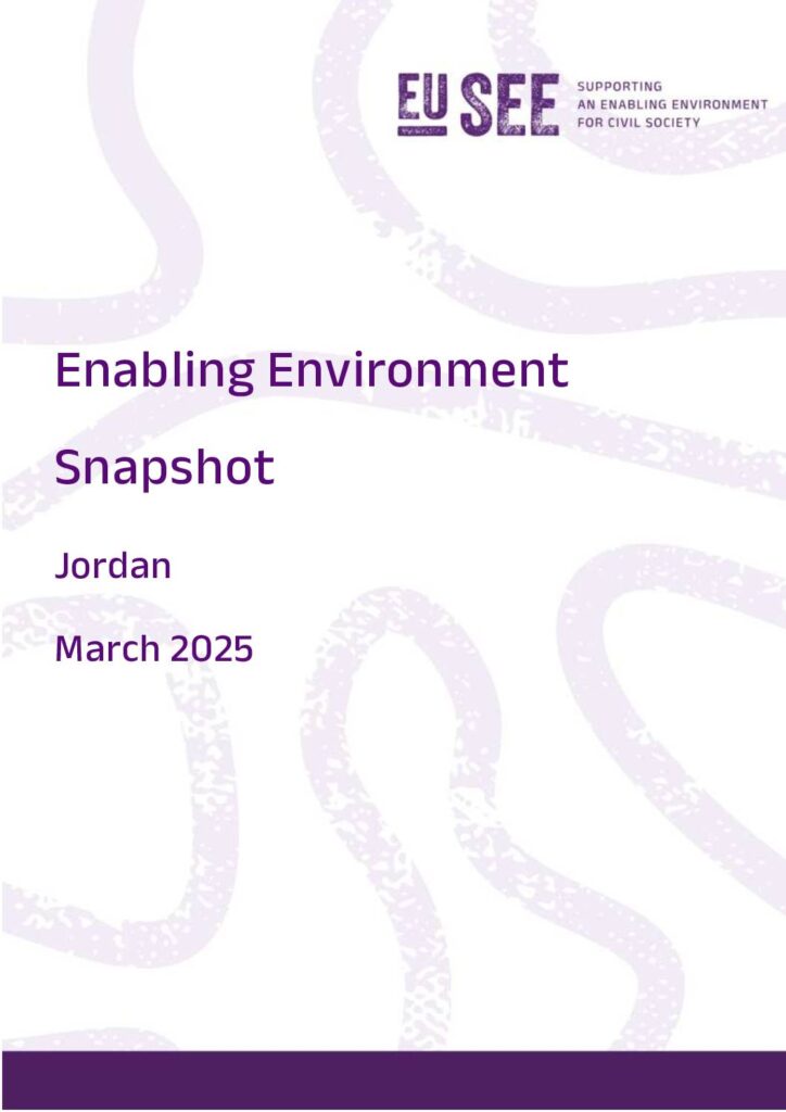 The current state of the enabling environment for civil society in each country part of this project is captured in a concise, two-page Enabling Environment Snapshot. This first Snapshot provides an overview of the enabling environment in Jordan and serves as a baseline for the next snapshots. These snapshots will focus on recent trends, shifts and developments for the previous four months across the six enabling environment principles, as well as highlight challenges and opportunities. The sixth principle ‘Access to a secure digital environment’ was not assessed in this first Snapshot, however, it will be included in the upcoming research outputs.
